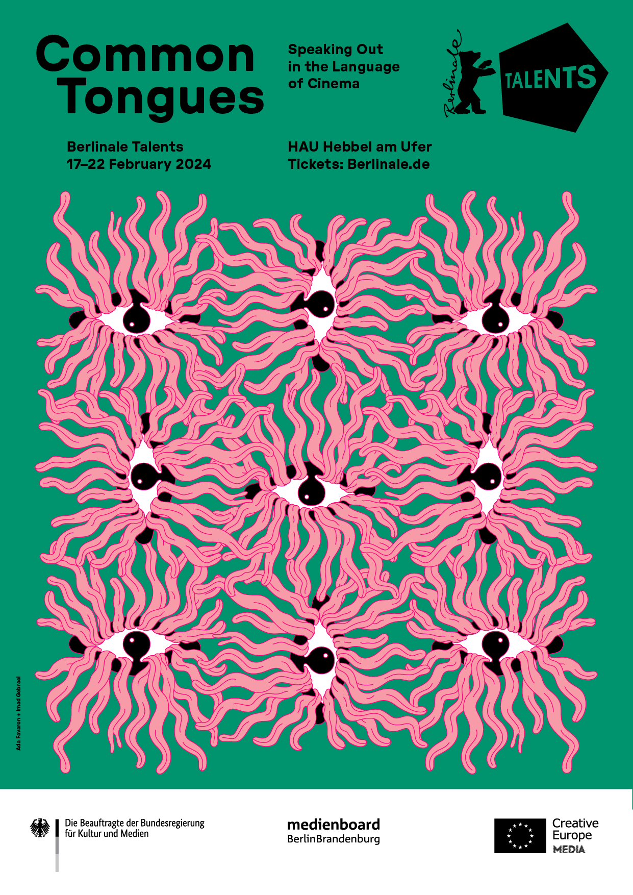 Ein Auge? Viele Münder? Jede*r für sich und doch alle gemeinsam? Das Berliner Grafiker*innen-Duo Ada Favaron und Imad Gebrael nehmen in ihrem Key Visual das Motto „Common Tongues – Speaking Out in the Language of Cinema“ im wahrsten Sinne des aktuellen Berlinale Talents Fokusthemas „Sprache“ beim Wort.